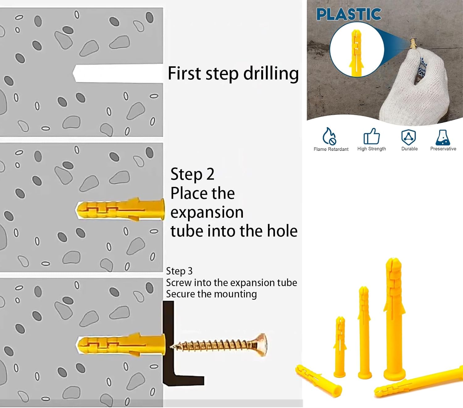 - The expansion anchor is made of Plastic material, flexible, not easy to break, can provide strong support, matching galvanised screws, carbon steel galvanised process.