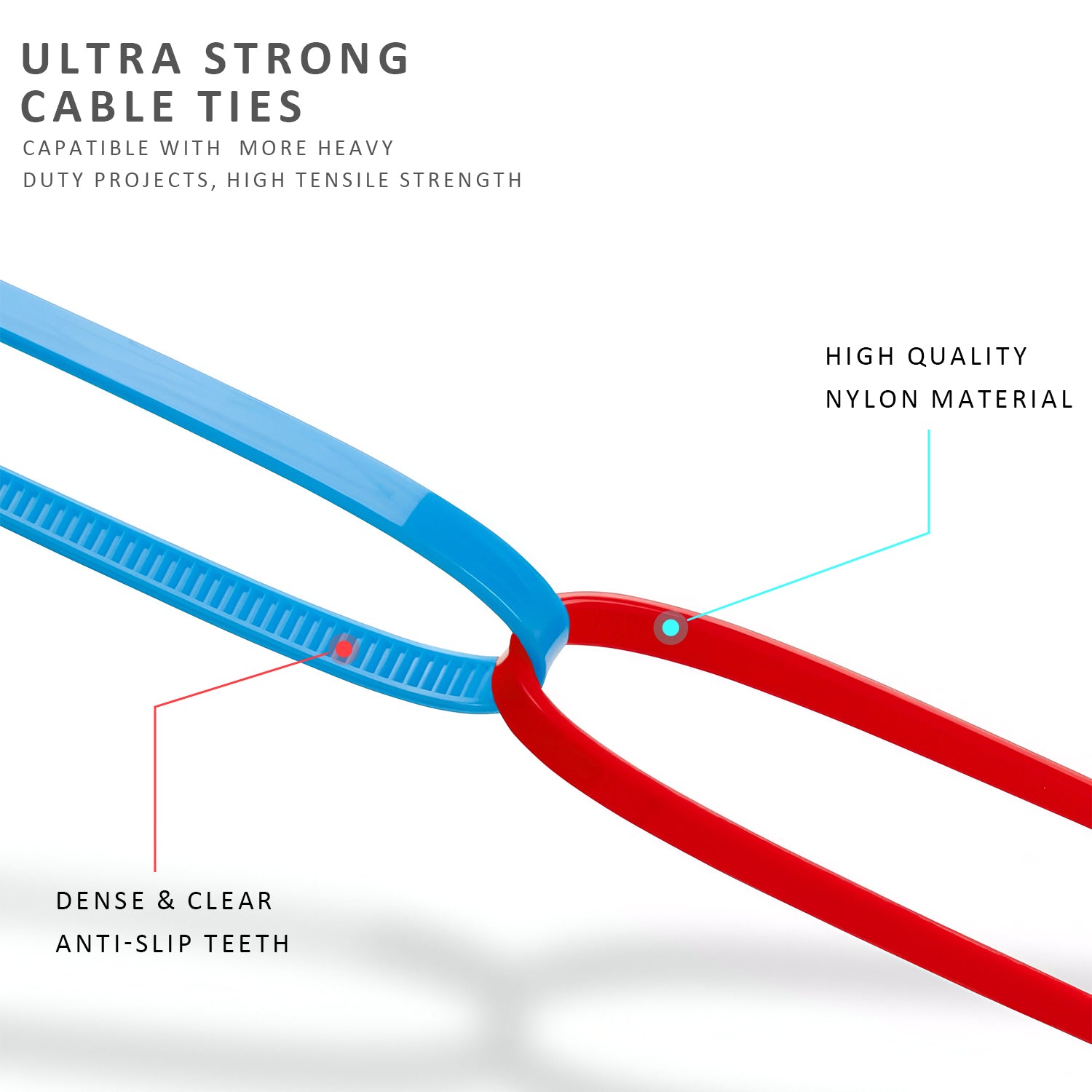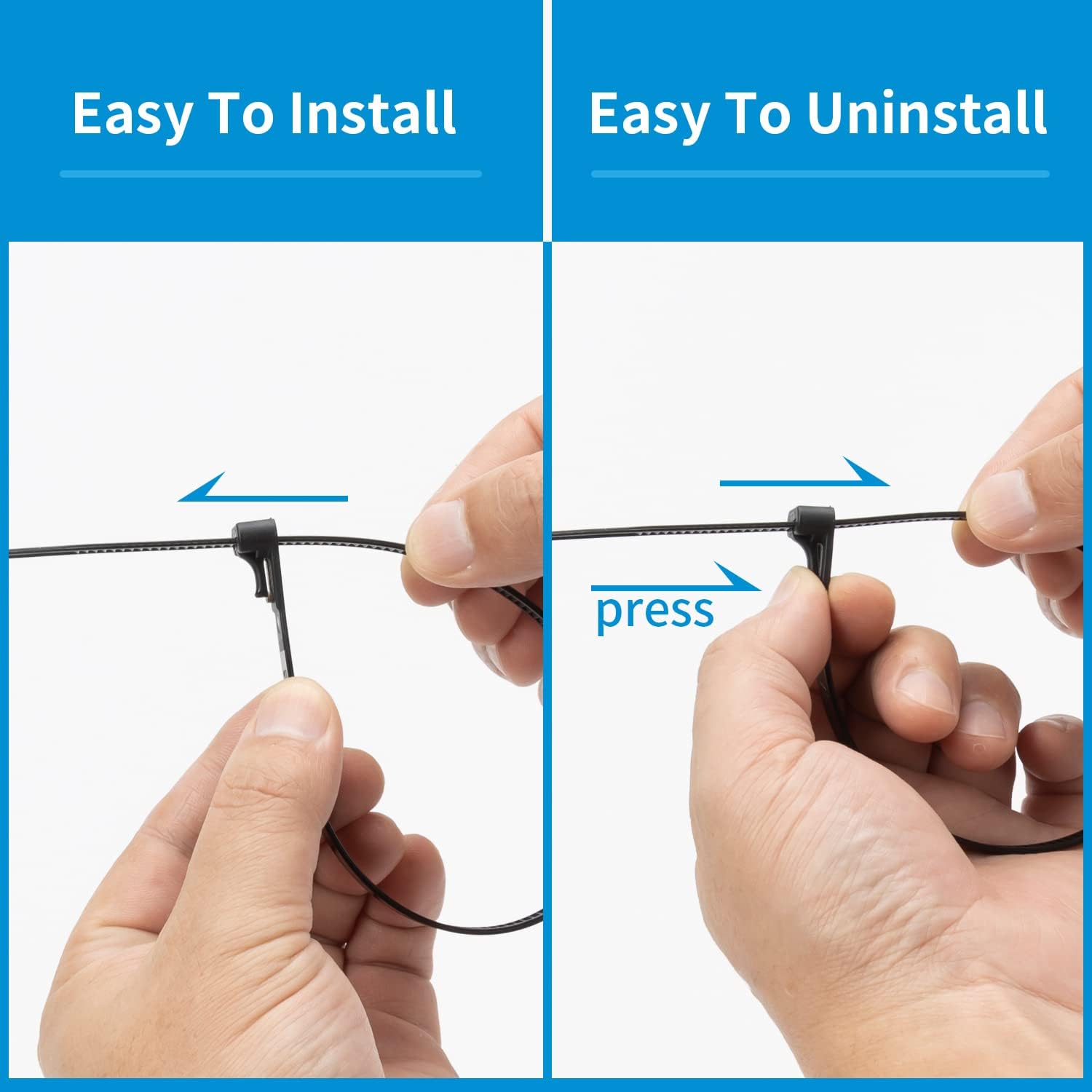 - The cable ties are designed to hook with rounded edges and strong locking teeth on the strip to prevent it from loosening once tightened.